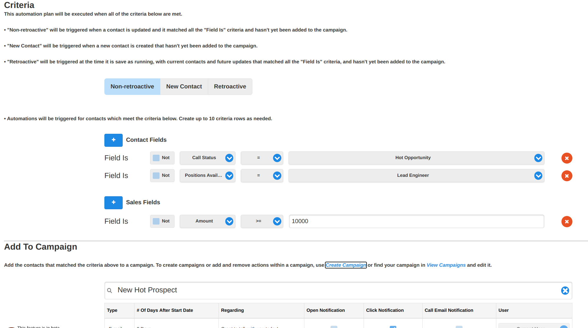 Criteria types are:- New Contact - Triggered when a new contact is added