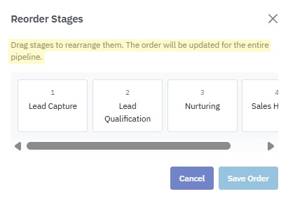 SalesNexus allows you to reorder pipeline stages at any time to better match how opportunities move through your sales process. By clicking the button, you’re taken to a dedicated view where stages can be dragged and dropped into a new sequence without deleting or recreating them. Once saved, the updated order is applied across the entire pipeline, immediately reflecting the revised workflow.