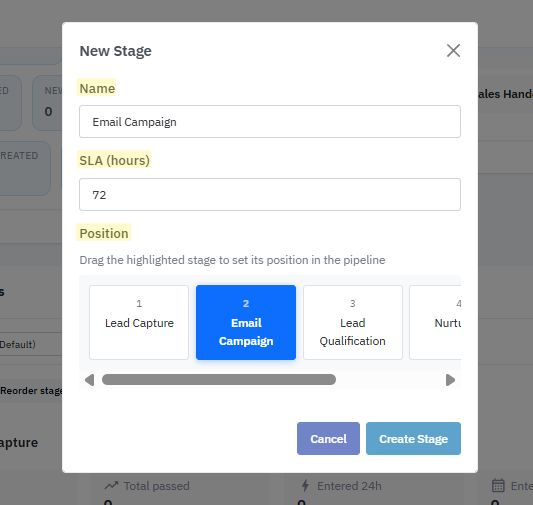 Stage position – allows you to insert the new stage into a specific position in the pipeline at the time of creation, rather than adding it only to the end. This makes it easy to refine or reorganize your pipeline flow without rebuilding stages later.
