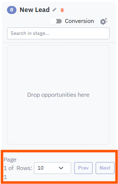 Stage pagination controls – Allows you to adjust how many opportunity cards display per stage column and navigate between pages when the number of records exceeds the visible limit.