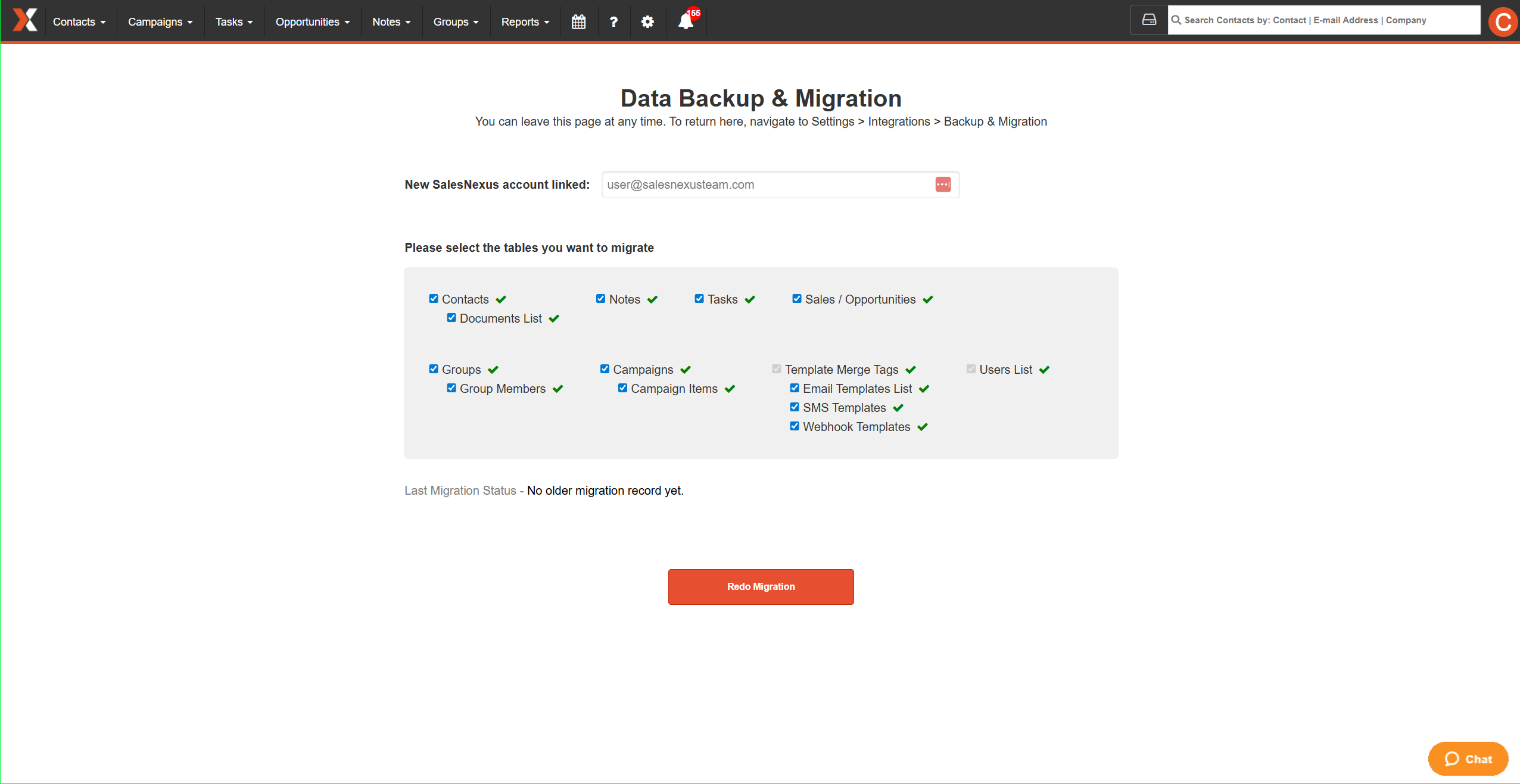 Settings → Integrations → Backup & MigrationYou may rerun migration if needed.