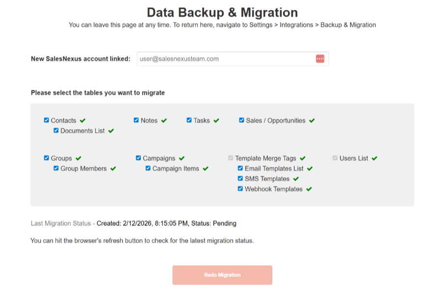 ✔ Check the boxes for the data you want to include in migration.